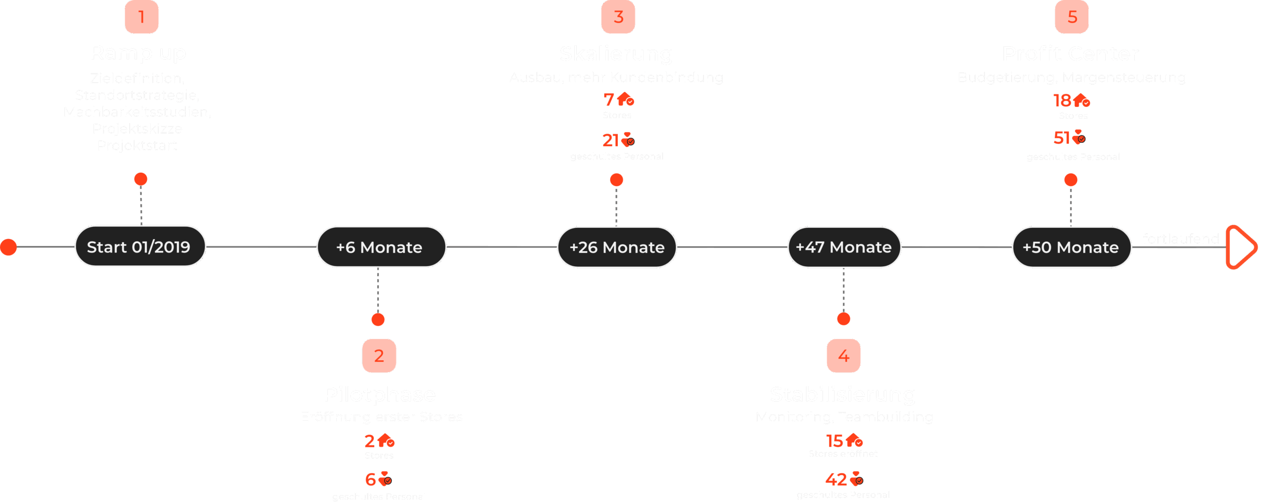 Eröffnung der ersten Stores und Test der Prozesse und Tools.